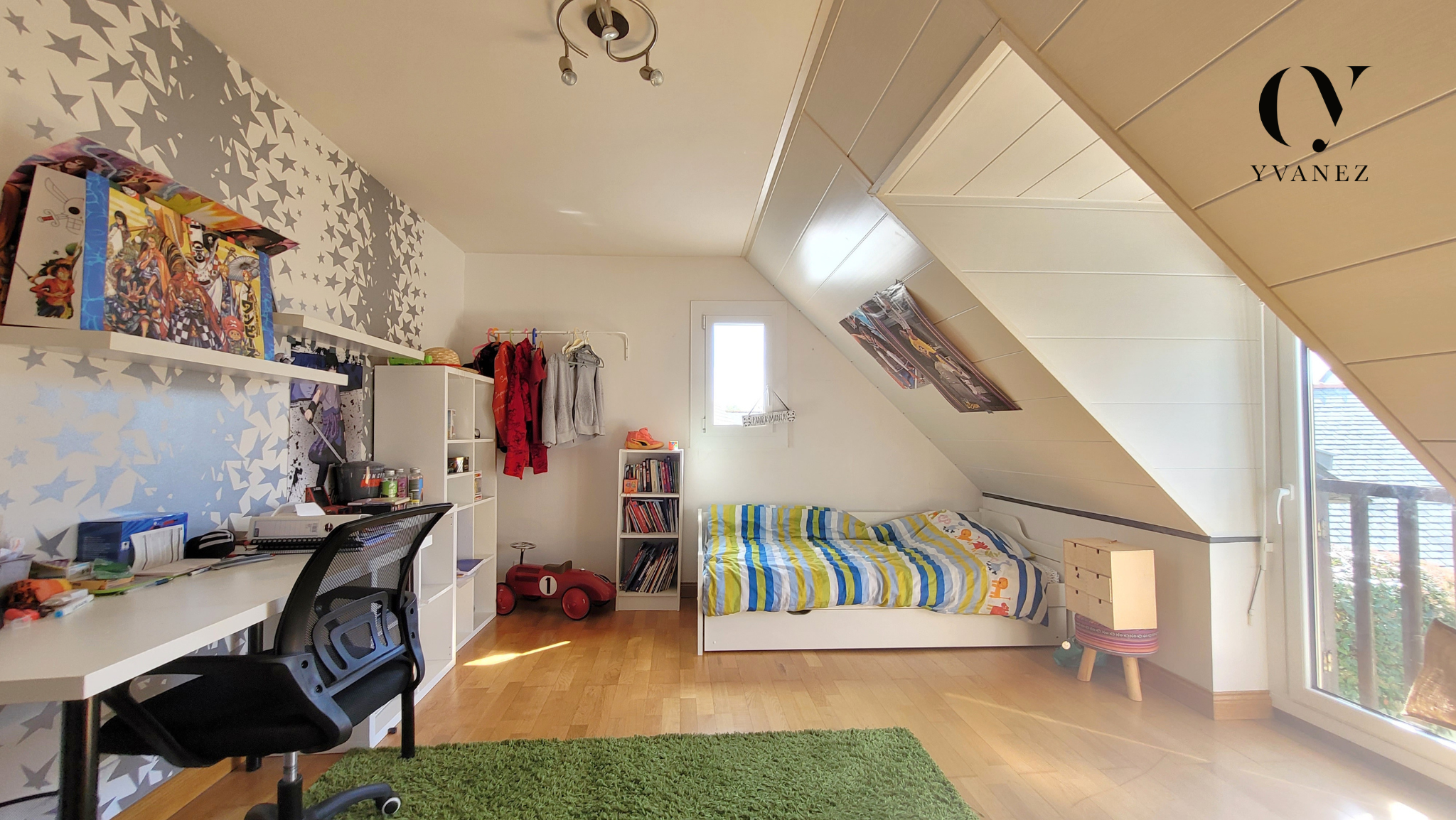 À l’étage, trois belles chambres se déploient, dont une aux volumes remarquables atteignant 35 m² au sol, offrant de nombreuses possibilités d’aménagement selon les besoins et les envies. Un salle de bains et des WC viennent compléter ce niveau.