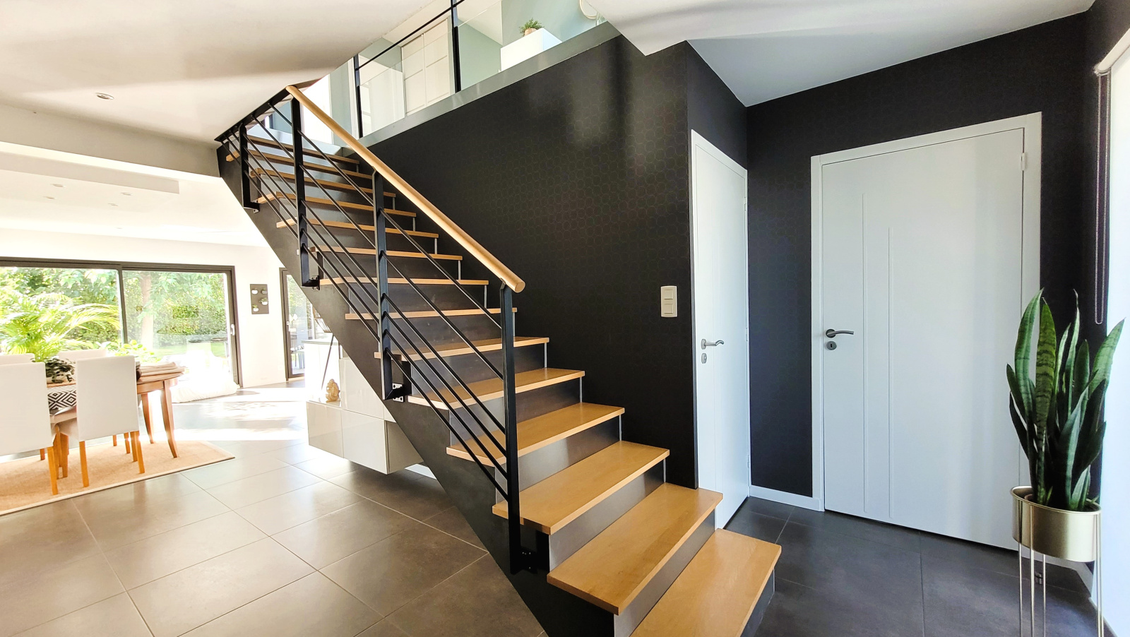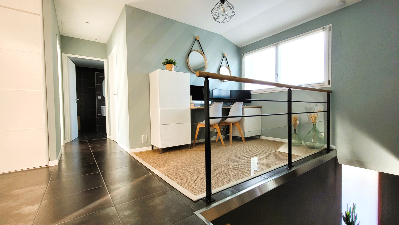 À l'étage, une mezzanine pouvant accueillir un bureau, trois chambres avec placards, dont deux avec accès à un balcon, une spacieuse salle de bains avec douche et baignoire, des WC séparés et un espace dressing commun.